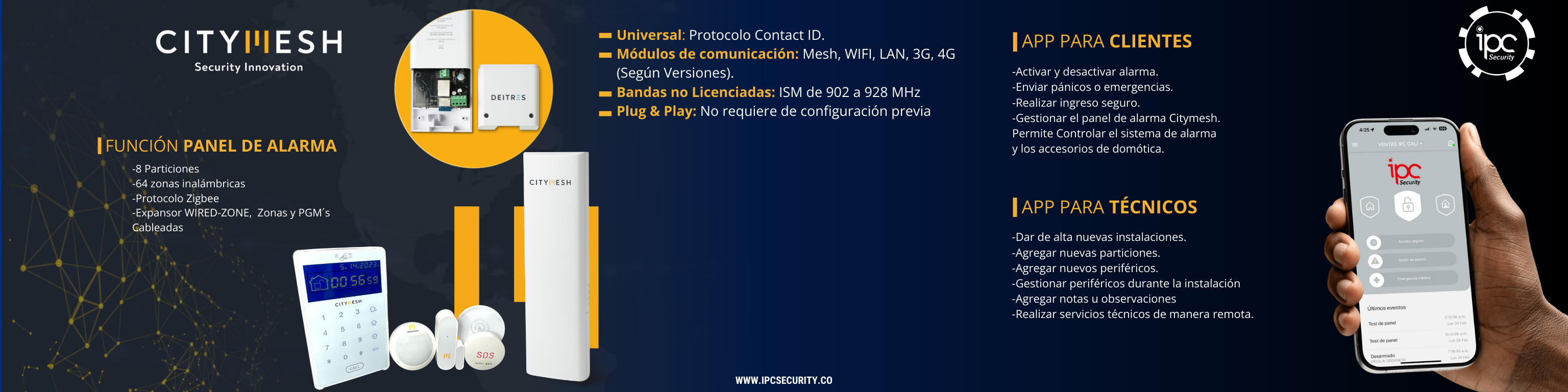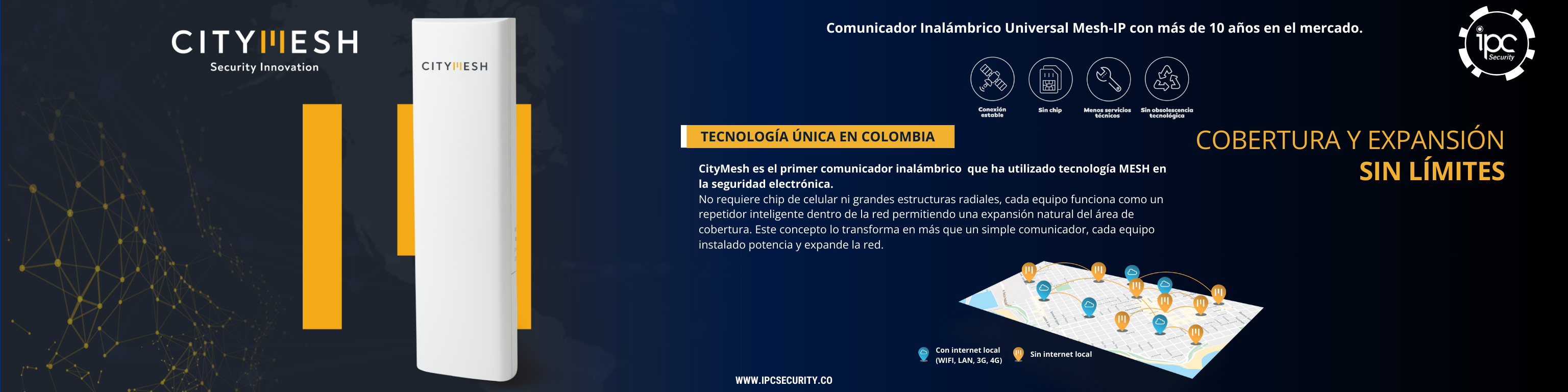 CityMesh es el primer comunicador de alarmas inalámbrico que utiliza tecnología Mesh, ofreciendo una red robusta y confiable que se expande sin límites. Cada dispositivo actúa como repetidor inteligente, asegurando cobertura total y comunicación eficiente en tiempo real.